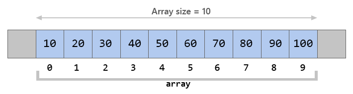 An array is the simplest and most widely used data structure. Other data structures like stacks and queues are derived from arrays. Here’s an image of a simple array of size 10, containing elements [10, 20, 30, 40, 50, 60, 70, 80, 90 and 100].